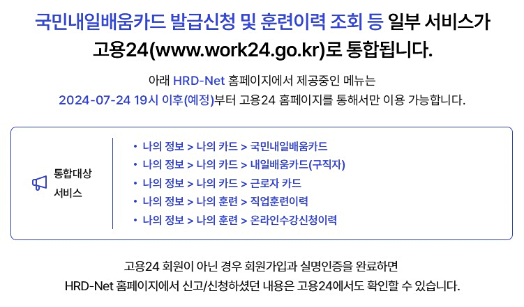 국민내일 배움카드는 이전에 고용노동부 직업능력 지식포털(HRD-Net)에서 신청과 발급을 하였으나 2024년 7월 24일 이후, 아래의 사진에서 보는 바와 같이 고용24(www.work24.go.kr)로 통합되어 이용이 가능해졌습니다.