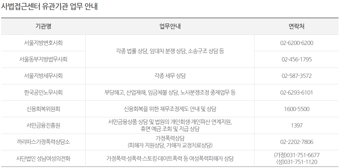 서울동부지방법원에서 '사법접근센터'라는 이름으로 무료법률상담소를 운영하고 있습니다.