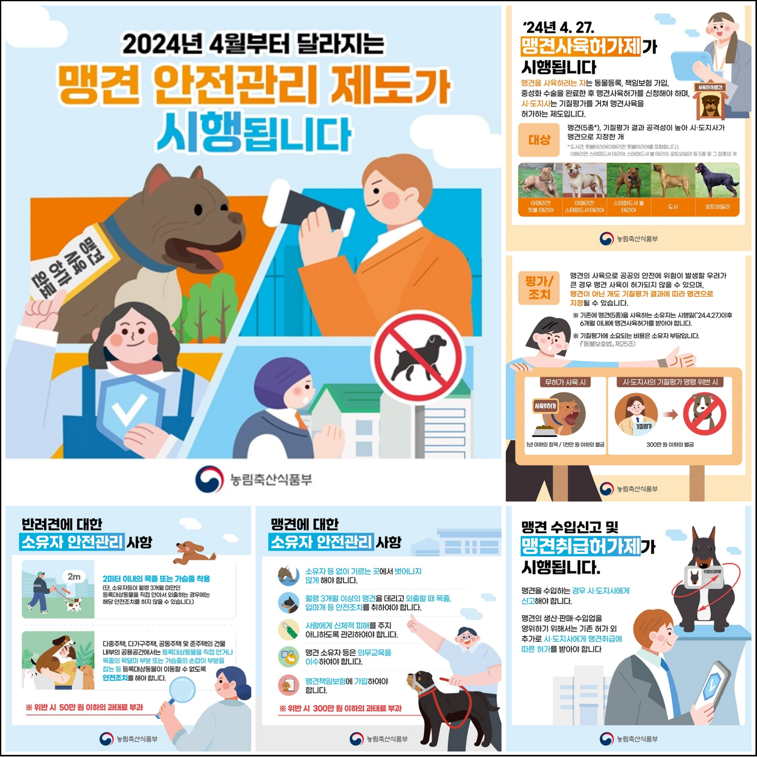 - 기존 맹견(5종)을 사육하는 소유자는 시행일(2024.4.27.) 이후 6개월 이내에 맹견사육허가를 받아야 합니다.